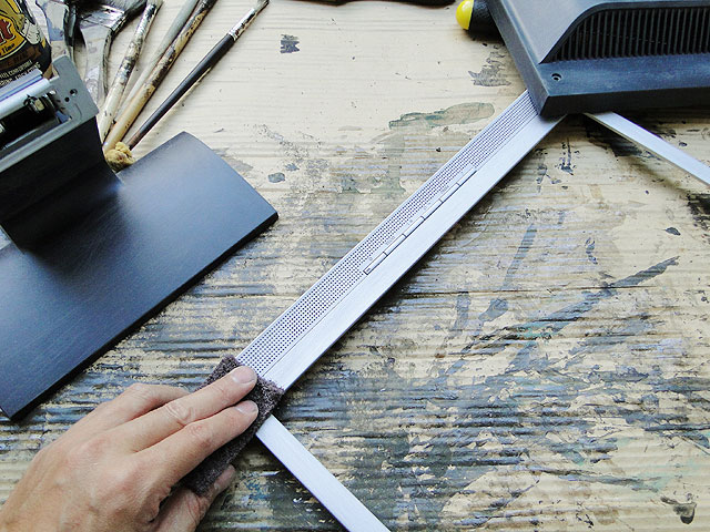 正面の枠にもヤスリを掛けて傷だらけにします