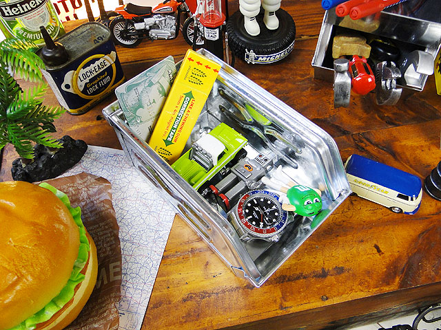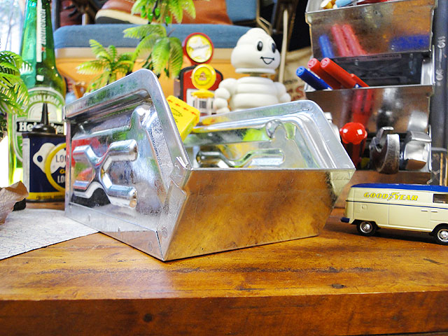 正直、機能面だけみたらプラ製の使い勝手のイイのはいくらでも見つかりますが、ボクらが欲しいのはそんな使い勝手うんぬんじゃなくて、まさにこの見た目の格好良さ!まるで映画に出てくるアメリカ人のワークデスクの上みたいに、無骨で男らしくて、基地っぽい・・・・そんなシーンが欲しいんだからね!サイズが小振りだから、まさに小さな基地っぽい雰囲気を作るのに最高に良い相棒になってくれます。