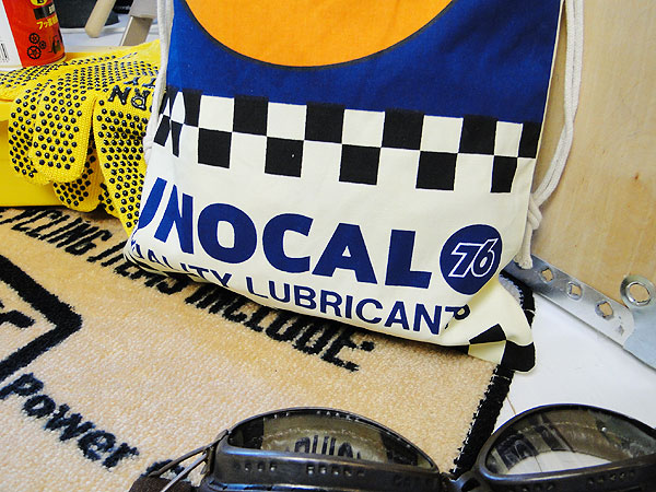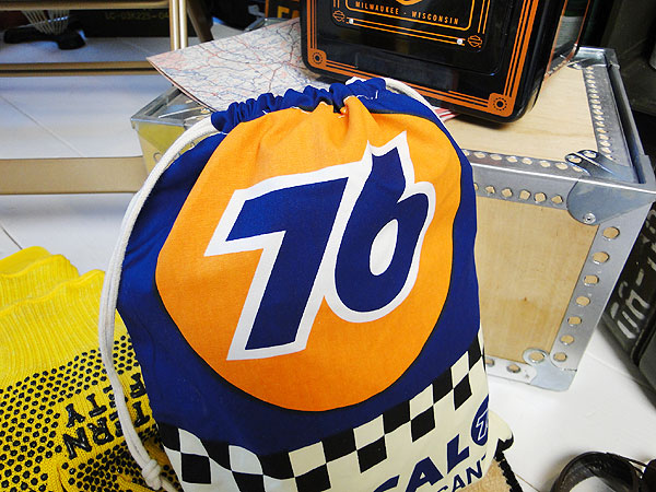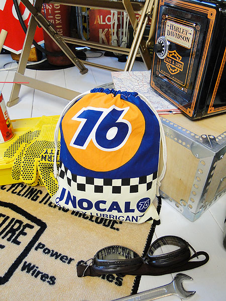 アメリカの直線道路を車で走ってると出会いそうなモーターオイル、ユノカル76の看板がモチーフになったキンチャク袋です。
