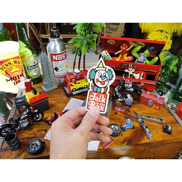 アメリカのハンバーガーショップ、ジャック・イン・ザ・ボックスから昔のロゴが描かれた可愛いステッカーが届きました。びっくり箱を意味するジャック・イン・ザ・ボックスからビヨヨーンとピエロが飛び出したアメリカらしいデザインになってます。ピエロの可愛いマークをお気に入りの小物にワンポイントで貼れば、アメリカンポップな雰囲気がグッと出てオススメだぞ!(≧∀≦)/サイズ:横5cm×縦10cm(約)