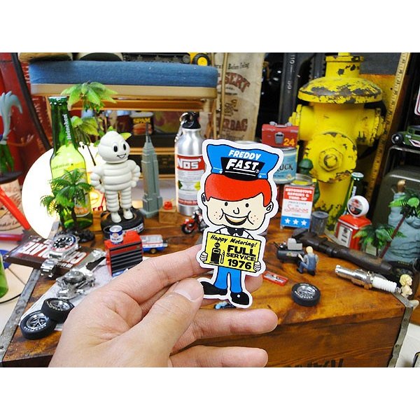 石油がいっぱい出るアメリカには昔から多くのオイルカンパニーが存在しましたが、そんな日本ではあまり知られていないオイルカンパニー、ダグラス・オイルカンパニーのキャラクター、フレディ・ファーストのステッカーがリリースされてるのを見つけてきました。実はアンティークでは昔からマニアに人気のあるキャラで、フィギュアなんかはかなり高額で取引されてたりするんです。アメリカでは珍しくガススタで、あれこれやってくれるフルサービスが自慢で、そのスタッフがモチーフになってるの!可愛いでしょ!身の回りの小物や、オイルカンパニーだけにツールボックスなんかのステッカーチューンにもピッタリ!ツウなアメリカ好きを気取ってどうぞ!( ̄ー ̄)ニヤリ☆