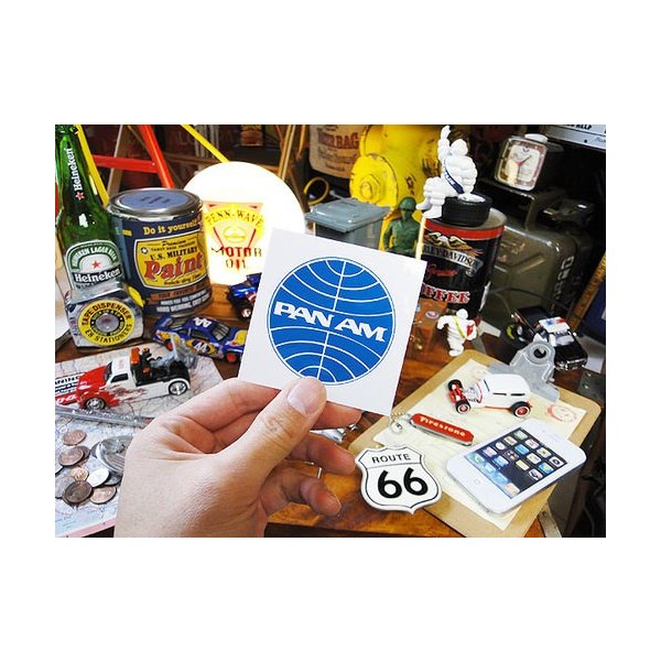 数あるエアーラインカンパニーの中でもカリスマ的な人気を誇るのが、このパンナム!おなじみの地球のマークが入ったヴィンテージのエアラインバッグは、今でも高値で取引されてます。そんなパンナムのロゴマークのステッカーが登場です。無地の小物やなんかにこのステッカーを貼ると、懐かしいアメリカがそこに戻ってきたって感じに変身するの!アメリカのゴールデンエイジの象徴的シンボルでもあるこのブランドは、ボクらの中ではやっぱり永遠だね!(*'-^)-☆サイズ:横7.4cm×縦7.4cm(約)