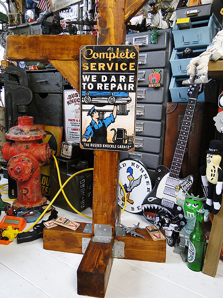 リフトにあげてクルマを修理する・・・・そんなシーンをアイコンにしたバステッドナックルガレージがスチールサインです。
