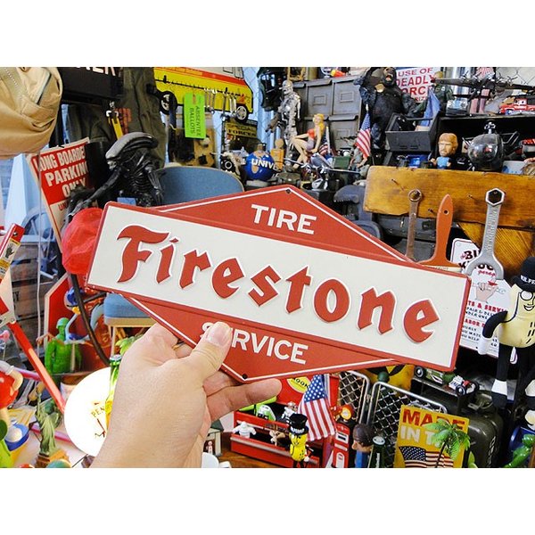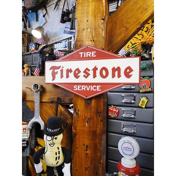 旧車好きから支持されるタイヤブランド、ファイアストンのロゴマークをデザインしたエンボス・ティンサインです。