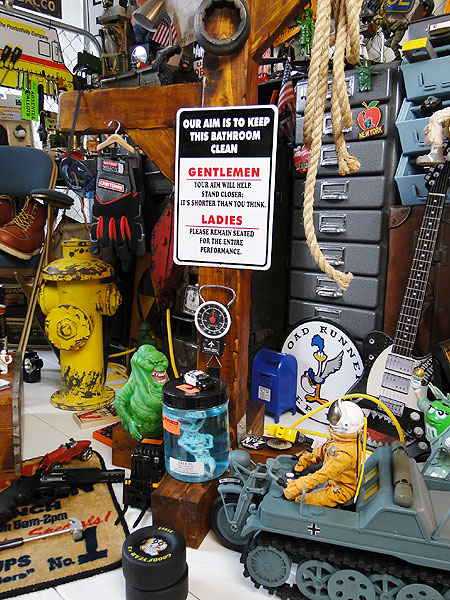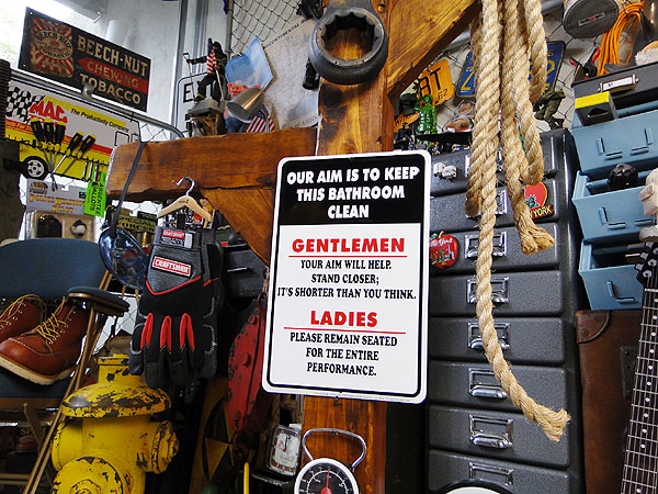 この看板のおもしろさは、アメリカのトイレにいかにもまじめに貼ってありそうなデザインなのに、読んでみるとご覧のとおりのアメリカンジョークが・・・・