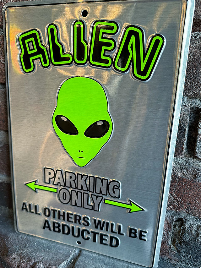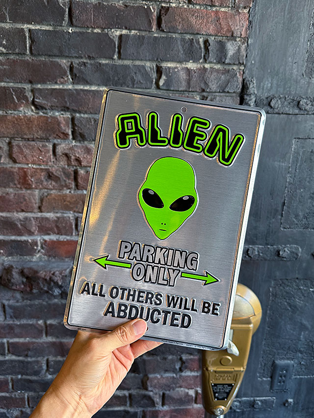 「ここはエイリアン専用駐車場につき、駐車禁止!」「エイリアン以外が駐車してた場合は連れ去るからな!」なんて書かれたジョーク看板。エリア51があるアメリカならではのグッズでしょ!こういうのはやっぱり向こうに行かないと手に入らないから、持ってると余計に嬉しい気分!看板はUFOのボディをイメージしたメタルな質感になっていて、そこがまた良い味出してるんです。家のガレージにいかが!щ( ̄∀ ̄)шサイズ:縦30cm×横20cm(約)
