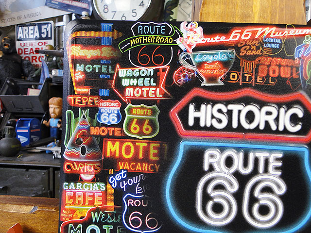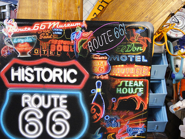 ボクらの好きな時代のアメリカってやっぱりネオンサインなんだよなー ルート66沿いの各地で見かける傑作ネオンを一堂に集めたという豪華なデザインの看板。 おなじみのロードサインからモーテルサインやキャデラックなど・・・・ アートな作品がいっぱい詰まったオールドアメリカ好きのための1枚です。 夜のムードをイメージしてディスプレイしたかった人にはうってつけのデザインだね! ( ̄ー ̄)ニヤリ☆ サイズ:縦20cm×横30cm(約)