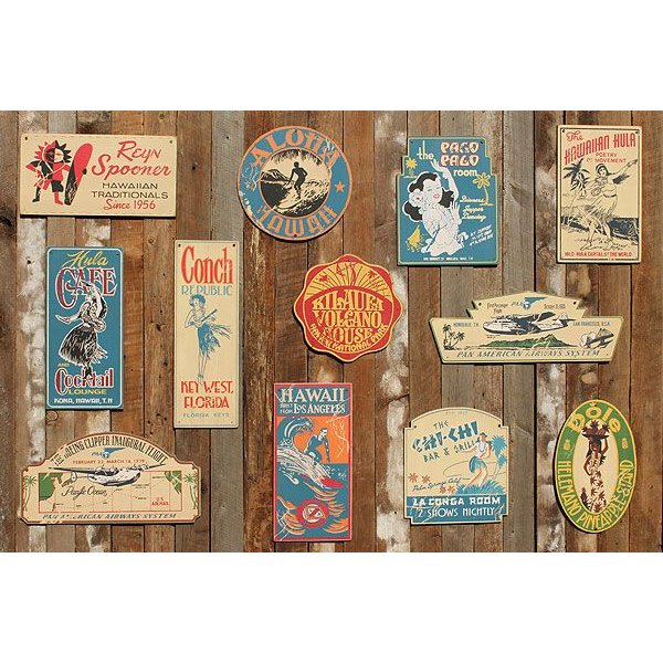 ハワイのアンティークショップを覗くと壁に飾られた昔のアドバタイジング看板を見かけることがしばしばありますが、そんな古めかしい木製の広告看板を復刻させたアドバタイジング・ウッドサインです。