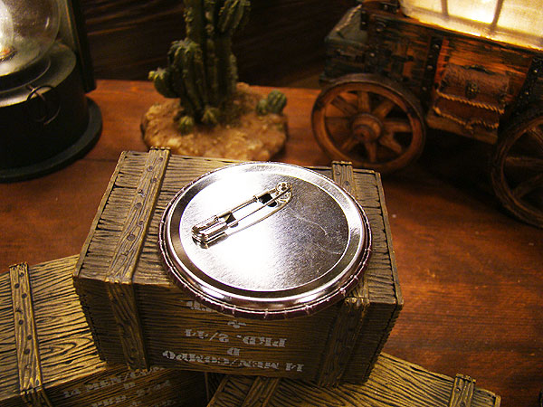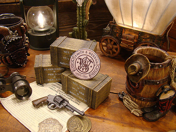 リボルバー銃の代名詞ブランドとも呼べるスミス&ウェッソンのロゴをデザインした缶バッジです。