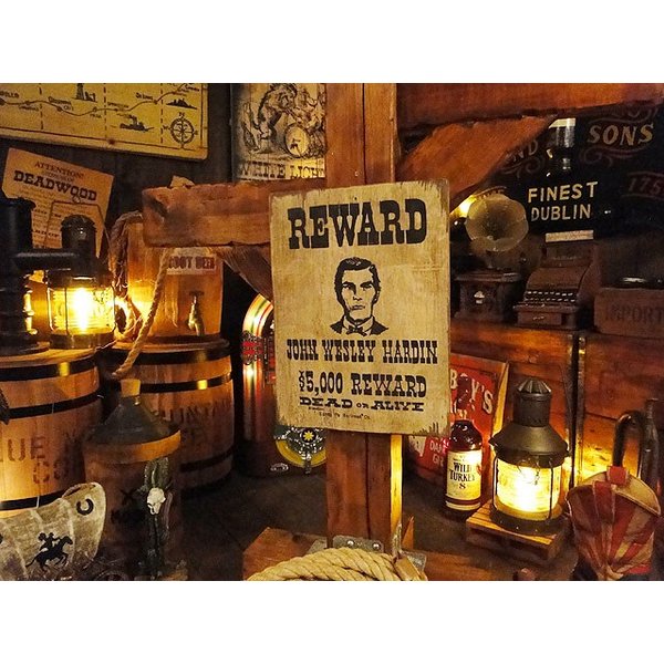 西部劇に登場するあのお尋ね者のウォンテッドポスターをモチーフにしたユニークな木製看板です。