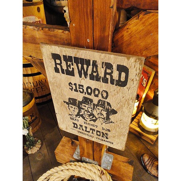 西部劇に登場するあのお尋ね者のウォンテッドポスターをモチーフにしたユニークな木製看板です。