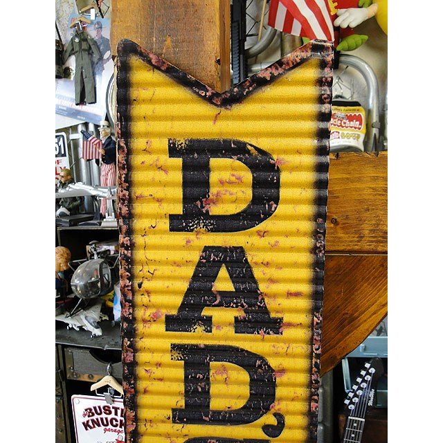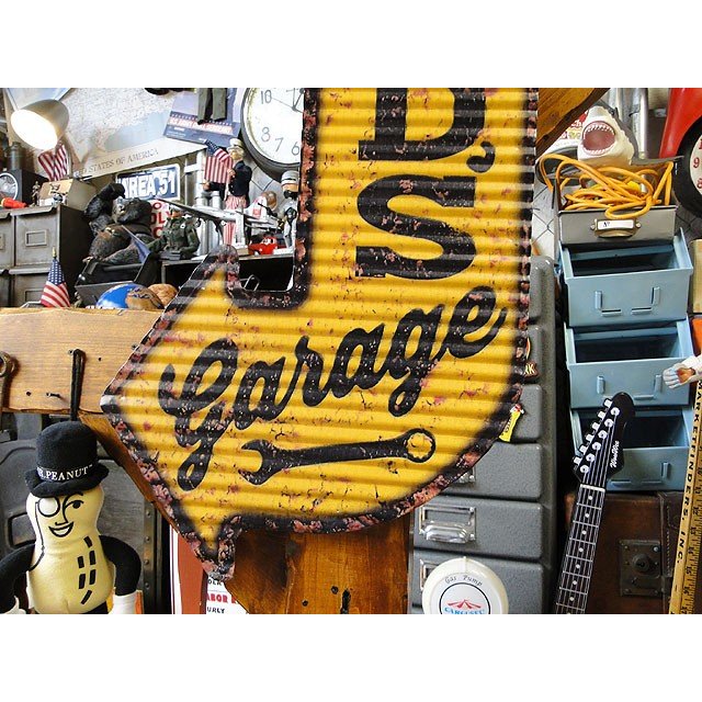 向こうのソーダショップでよくこの手の矢印形看板を見かけますが、そのデザインを流用してお父さんのガレージ仕様にしたってヤツ!