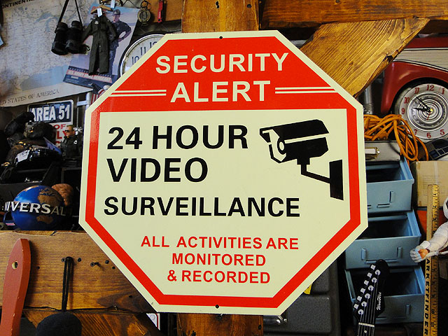 今やセキュリティカメラが安く手に入る時代になったので、個人でこの手のサインを付けておいても、本当にありそうなだけに、たとえ実際にはカメラはなくとも抑止力には効果大です。あと、秘密基地の雰囲気を出したいって時にも、間違いなくイイ仕事してくれますので、そういう意味でもイチオシのサインです。