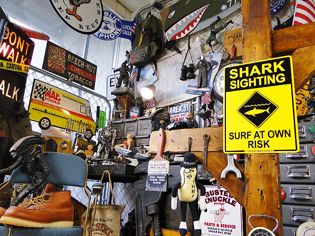 海外のビーチでたまーに見かける「サメに注意」の看板がモチーフになっていて、「サメが目撃されています。サーフィンは自己責任で」なんて書かれてる・・・・「サメ」がキーワードの看板です。