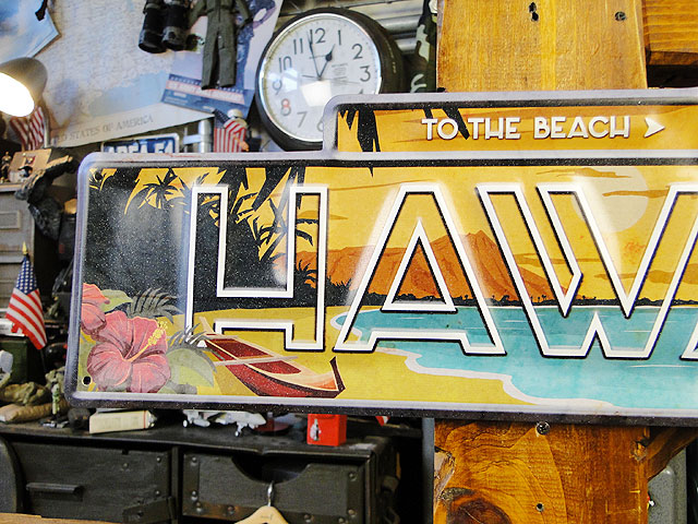 ハワイと言えばのあの場所、ワイキキビーチの昔の姿が描かれた・・・・レトロなハワイアン・エンボスティンサインです。