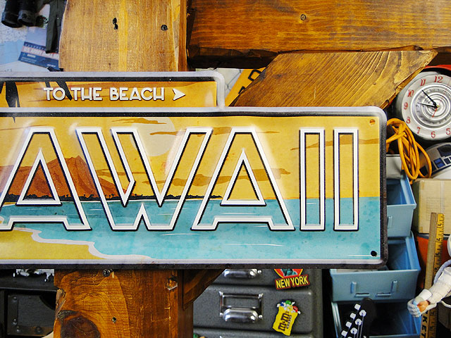 「ビーチはこっち!」って案内する看板風になっていて、ハワイのエンボス文字が入ってる・・・・ベタなデザイン。