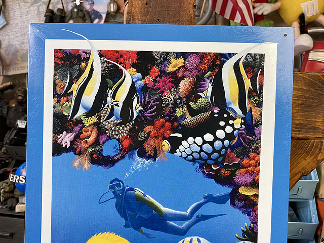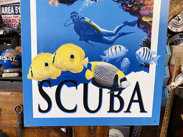 あの感動的な海の世界をまた味わいたい・・・・そんなスキューバーダイビングの世界を描いた珍しいブリキ看板です。