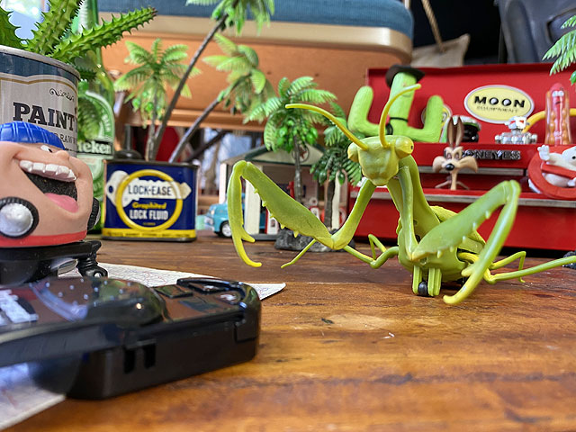 首のあたりにオレンジ色のLEDライトを内蔵していて、電源をONにすると点灯するんだけど、まるで本物の命が吹き込まれたかのように、生命力がみなぎってる気がして・・・・ああ、小学生時代にアイツと夢中でカマキリ捕りをしたあの頃を思い出すぜー