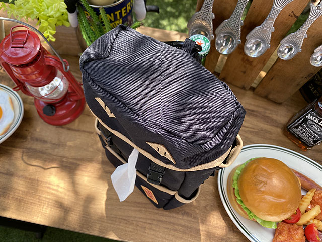 後ろ側には、カラビナッフックとショルダーストラップ風のベルトも付いていて、実はこのベルトも単なる飾りじゃなくて、このままアウトドアチェアーの背もたれ部分に引っかけておけるので、キャンプシーンで大活躍してくれるんです。