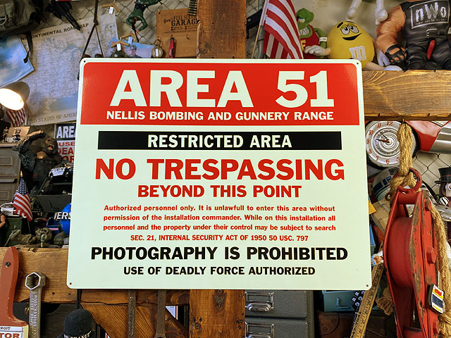アメリカはネバダ州にある空軍基地「エリア51」に実際に立ってる看板を完全再現したっていう・・・・ボクらの大好物な看板です。