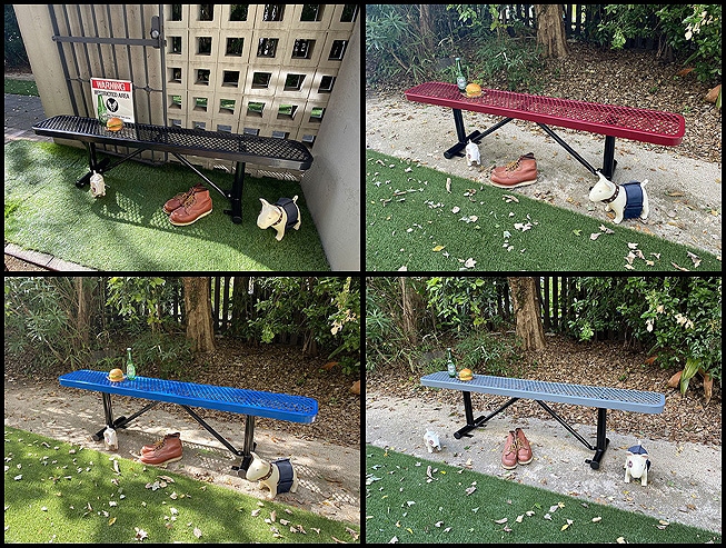 アメリカやカナダの公園、バス停などの公共施設から、スケボーパークやバスケットコートの周りなどなど・・・・向こうに行くと見かけるスチール製のゴツいパークベンチを完全再現した屋外対応のベンチシートです。