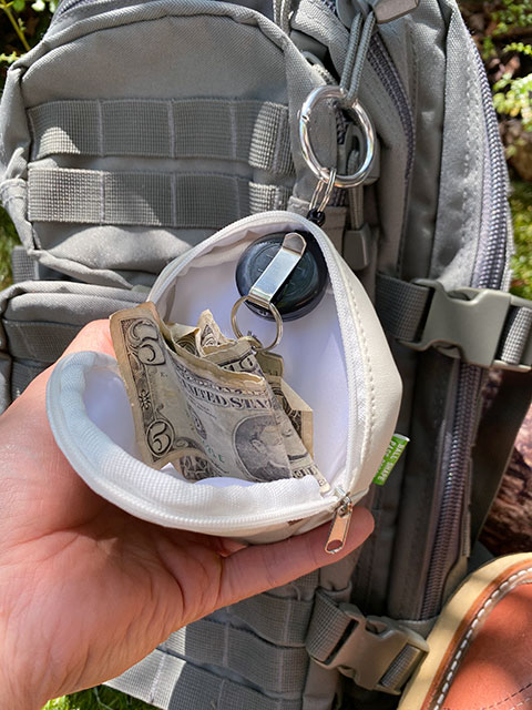 本体はファスナーを開けると小物入れになっていて、小銭の他に、目薬やガム、ミントなんかを入れておくとサッと取り出せて便利!