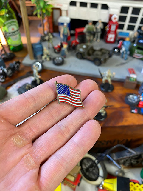 ジャケットや帽子、バッグなどなど・・・・自分らしさをさりげに演出できる昔から定番のアクセントアイテム、星条旗のピンバッジです。