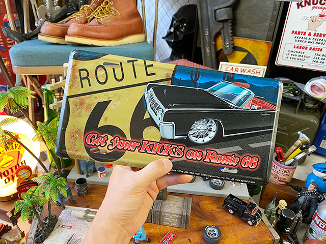アメリカのゴールデンエイジを描いたルート66のライセンスプレートです。