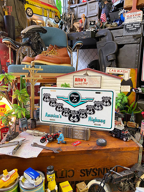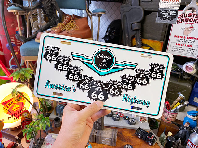 オールドアメリカのシンボルマーク、ルート66のロードサインのブラックバージョンが一堂に集まったオールスターデザインのライセンスプレートです。