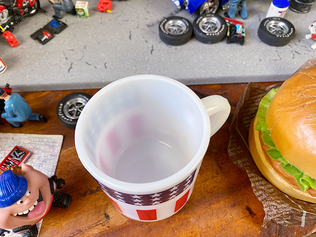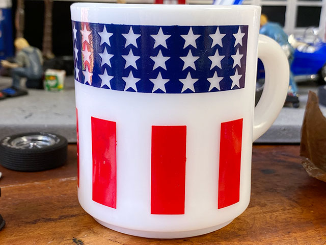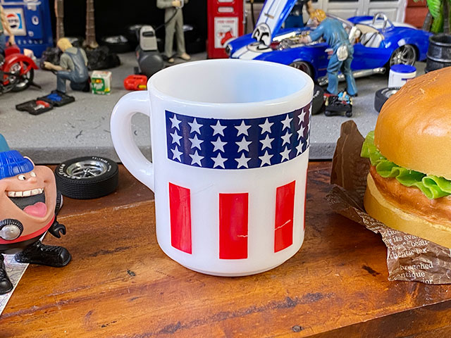 マグってコーヒーを飲むための食器なんだけど、この星条旗柄のミルクガラスマグだと、見た目だけでも美味しいもんなー