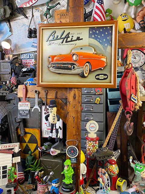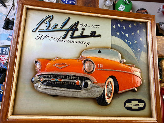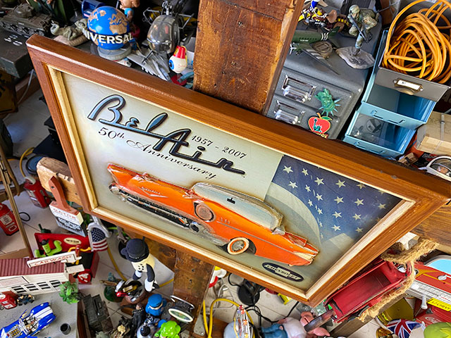 ミスターフィフティーズカーこと、1957年式シボレー・ベルエアが描かれた木製看板です。