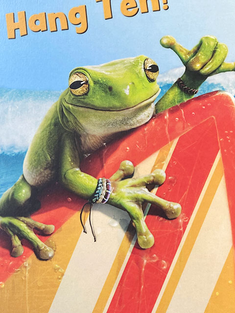 ボードを片手にハングルーズで決めるお茶目なカエル!