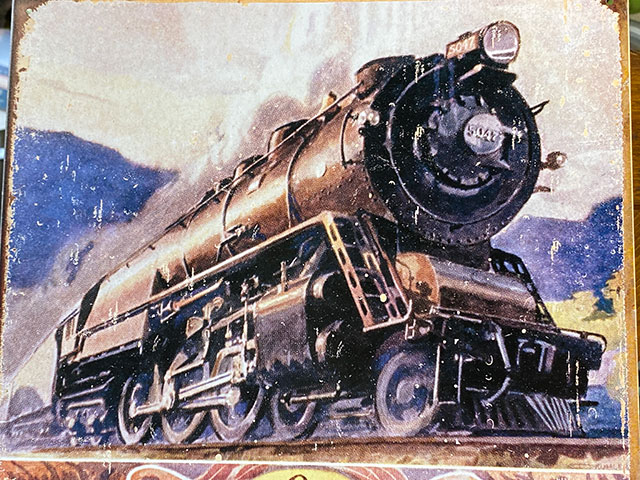 1930年代の古めかしい蒸気機関車が描かれた貴重な看板で、全体をアンティークフィニッシュ加工で仕上げてあるので、まるで何年も使い込まれた看板のようなヴィンテージの風合いを買ってすぐに楽しめるのが魅力です。
