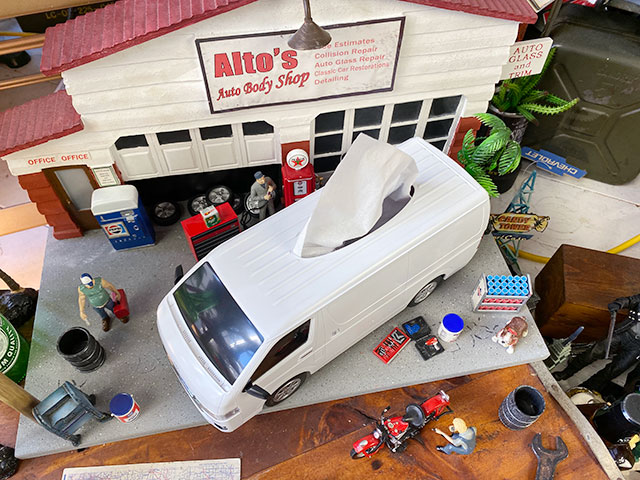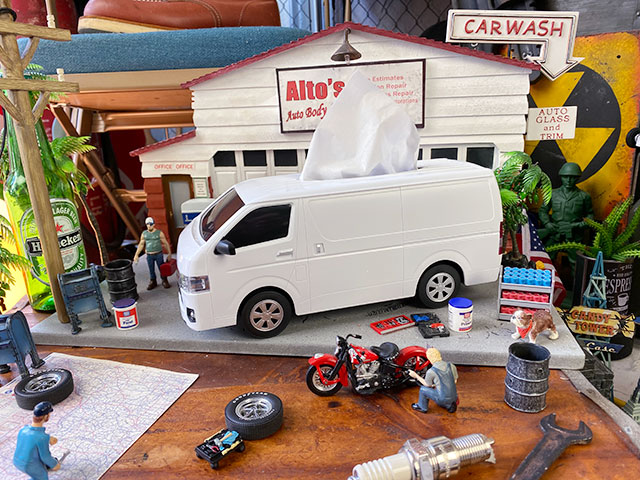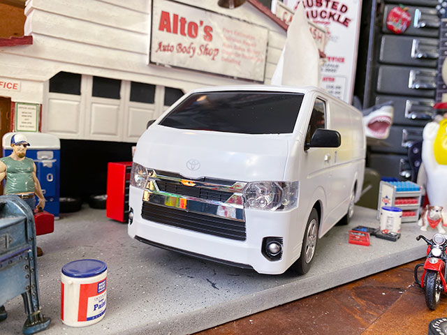 本体はプラ製で、海外のミニカーメーカーが手がけただけあって、ハイエースのカタチも完璧に再現されています。