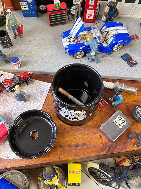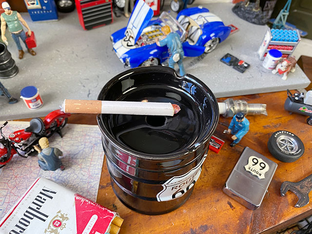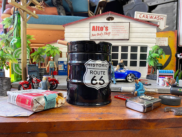 伝説のハイウェイ、ルート66をテーマにデザインされたドラム缶型灰皿です。