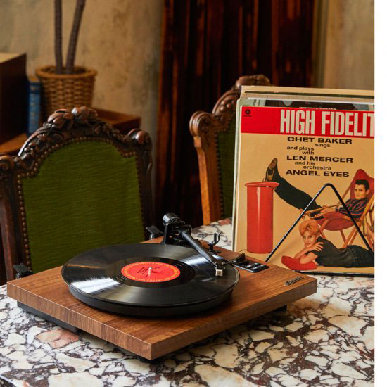 ミッドセンチュリー時代を思わせてくれるMDFを使ったウッド素材のレコードプレーヤー&スピーカーセットで、ご覧のとおり見た目がとにかくメチャクチャおしゃれなの!