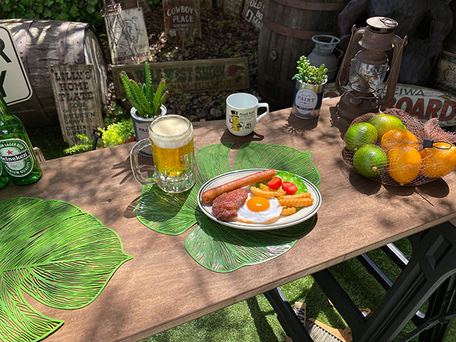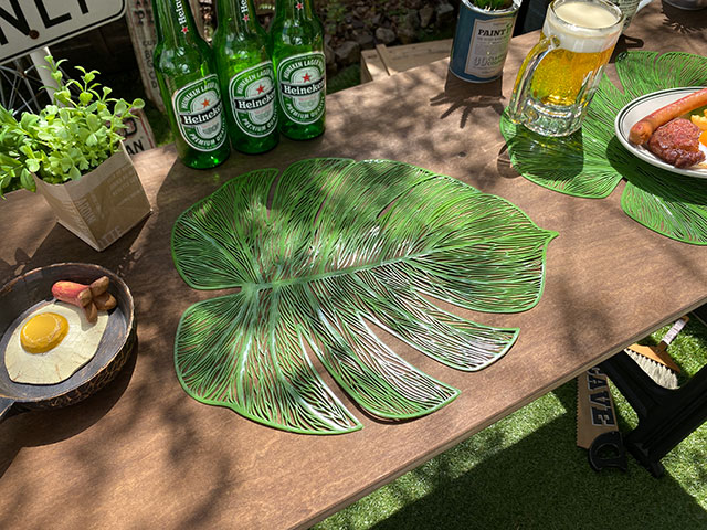マット自体はいわゆる造花の葉っぱみたいな素材でできていて、それをテーブルにバサッと敷いて自然っぽいノリを楽しもうって発想のプレースマットなんです。
