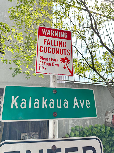 この看板はハワイのアチコチで見かける「ココナッツの落下に注意」って看板です。