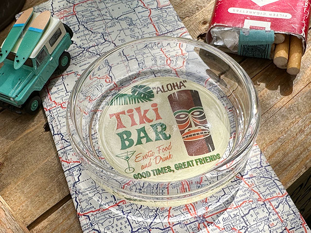 ハワイのモーテルやローカルフードショップに置いてありそうなアドバタイジング系デザインがされたガラス製の灰皿です。
