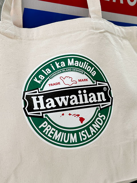 「ハイハイ、おなじみのビールね!」と思いきや、よく見ると「ハワイアン」ってなっちゃってる・・・・パロディデザインのユニークなエコバッグです。