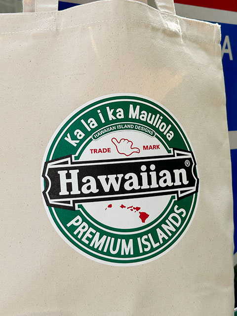 「ハイハイ、おなじみのビールね!」と思いきや、よく見ると「ハワイアン」ってなっちゃってる・・・・パロディデザインのユニークなエコバッグです。