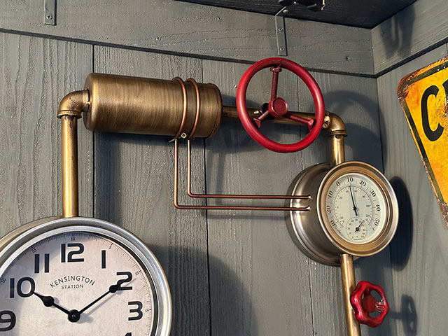 本体はスチールとMDF素材でできていて、ギアやメーター、バルブに回転ハンドルなどなど・・・・あたかもそれらが動力源になって動いてるって雰囲気でしょ!