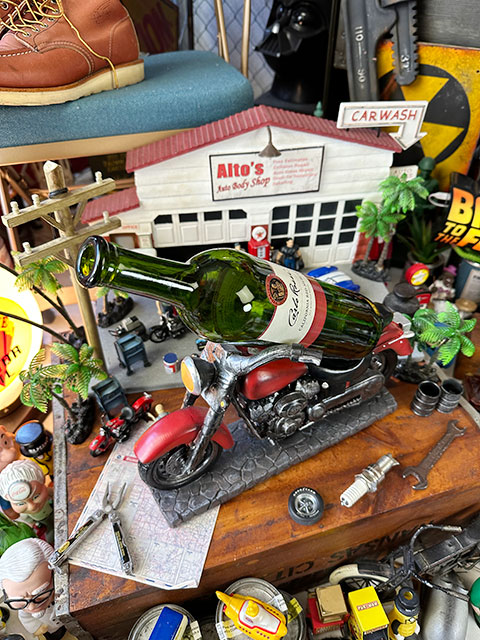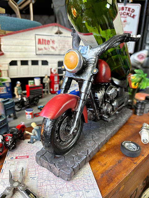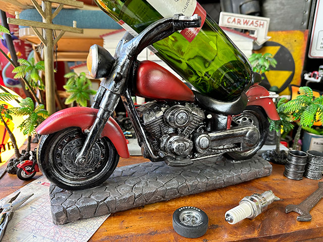 アメリカンバイクの巨大なスタチューかと思いきや、ワインボトルをシートに載せて使うワインホルダーっていうユニークなヤツなんです。