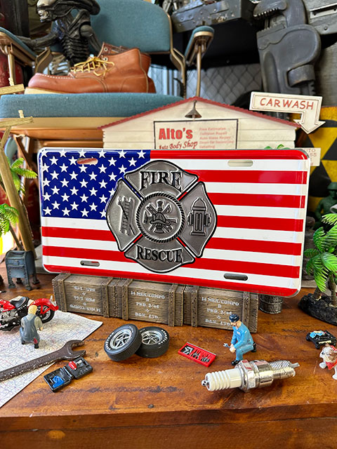 ファイヤーデプト & 星条旗 ライセンスプレート ファイヤーマン アメリカ消防士