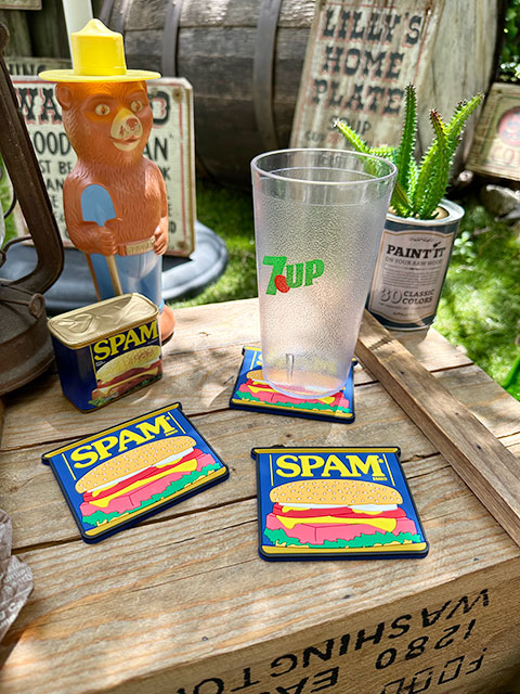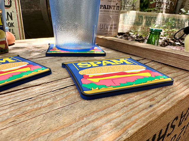 スパムのレトロなロゴマークが入ったラバーコースターです。