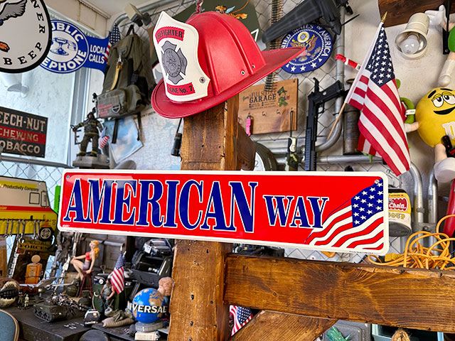風になびく星条旗に「ア・メ・リ・カ・ン」の英文字が堂々とデザインされたアメリカンウェイのストリートサインです。 今あるシーンをアメリカンな雰囲気で盛り上げたいなら、やっぱり星条旗は欠かせないデザイン! こういうパトリオットデザインの看板を飾って、シーンに星条旗を取り入れるのもオシャレな技です。 ○○町のアメリカ合衆国を目指して、アメリカンストリートを建設せよ!( ̄ー ̄)ニヤリ☆ サイズ:縦12.5cm×横60.8cm(約) 材質:ブリキ