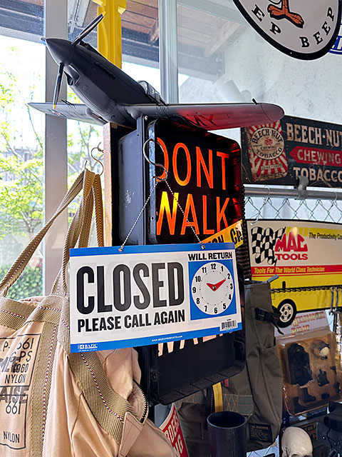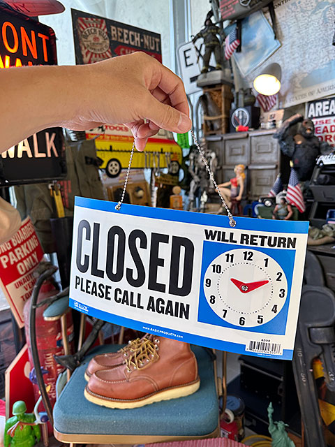向こうじゃ個人オーナー店だと当たり前にあって、そんな時は「何時にお店に戻ります」ってのをこのサインの時計で案内するの!