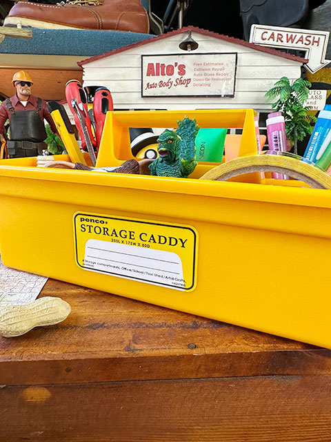 アメリカのホームセンターに行くと目にするフタなしタイプの道具入れ「ストレージキャディ」を、机上サイズにスケールダウンさせたっていう・・・・ステーショナリーブランドのペンコならではの収納グッズです。