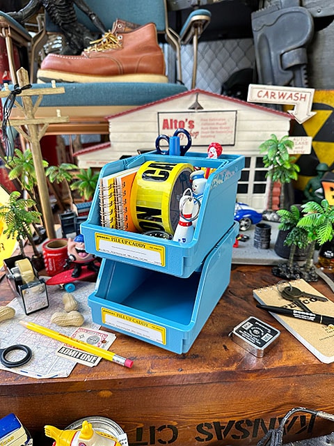 アメリカのガレージや倉庫などで目にする積み上げ可能な収納ボックス「パイルアップキャディ」を、机上サイズにスケールダウンさせたっていう・・・・