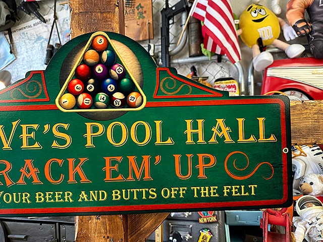 「外国のプールバー」をテーマにしたストアサイン風のヘヴィースチールです。
